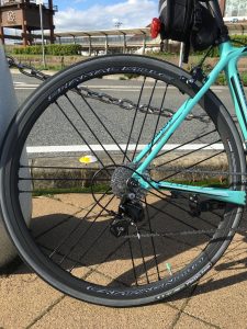 ただ、クランクが今主流のコンパクトクランクなので最高速はあまりでません。ケイデンスを高めにしてスピードを稼いでいこうという思想です。なので街中で走っている分には楽なのですがレーシーで本格的なロードバイクにはスイスイと抜かれてしまいます。