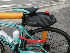容量が2.7リットルあるので今までメッセンジャーバッグに入れていた輪行バッグと財布とサイクルロックがバッチリ入ります。その上、今までのトピークのサドルバッグに入れていた替えチューブ、インフレーター、ボンベ、携帯ツールを入れてもまだ余裕があります。